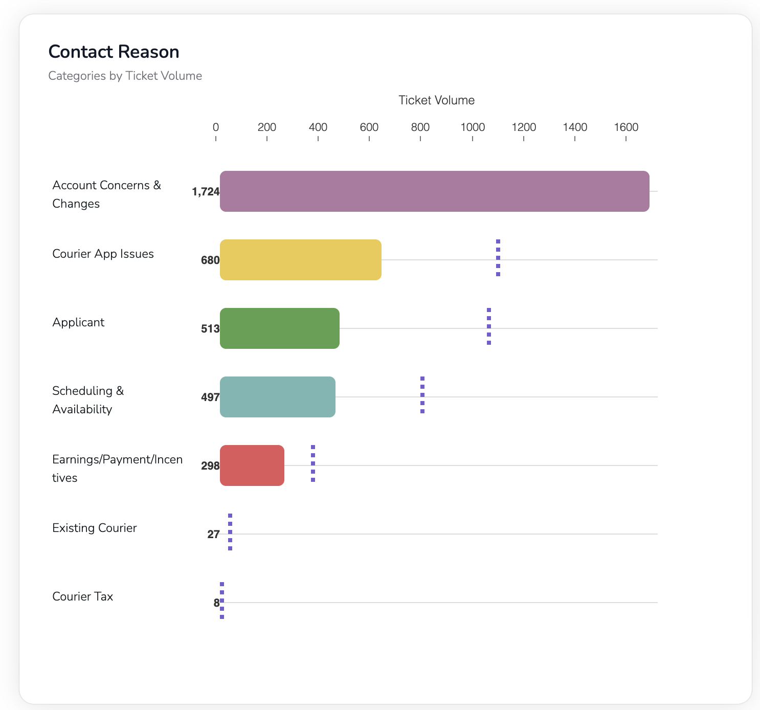 In the fast-paced world of on-demand logistics, keeping a finger on the pulse of customer concerns is essential. The Contact Reason bar chart above does exactly that: it ranks the top support-ticket categories by volume in the current period (solid bars) and flags each category’s volume in the previous period (dotted lines). By pairing absolute counts with historical context, it paints a clear picture of where your team’s attention is—and where it needs to be.