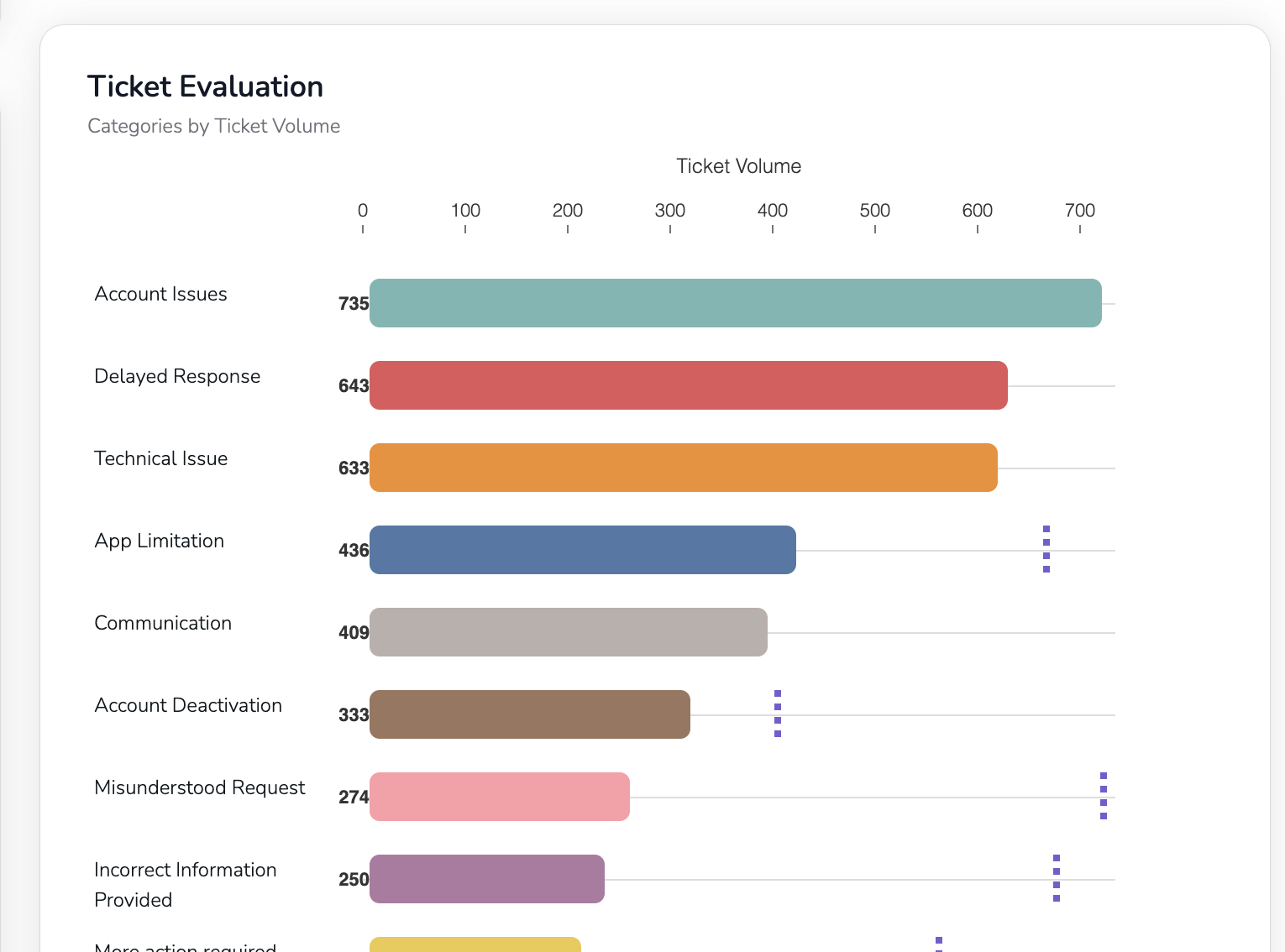 - Hovering over a bar shows a tooltip with the exact ticket count and percentage of overall volume.