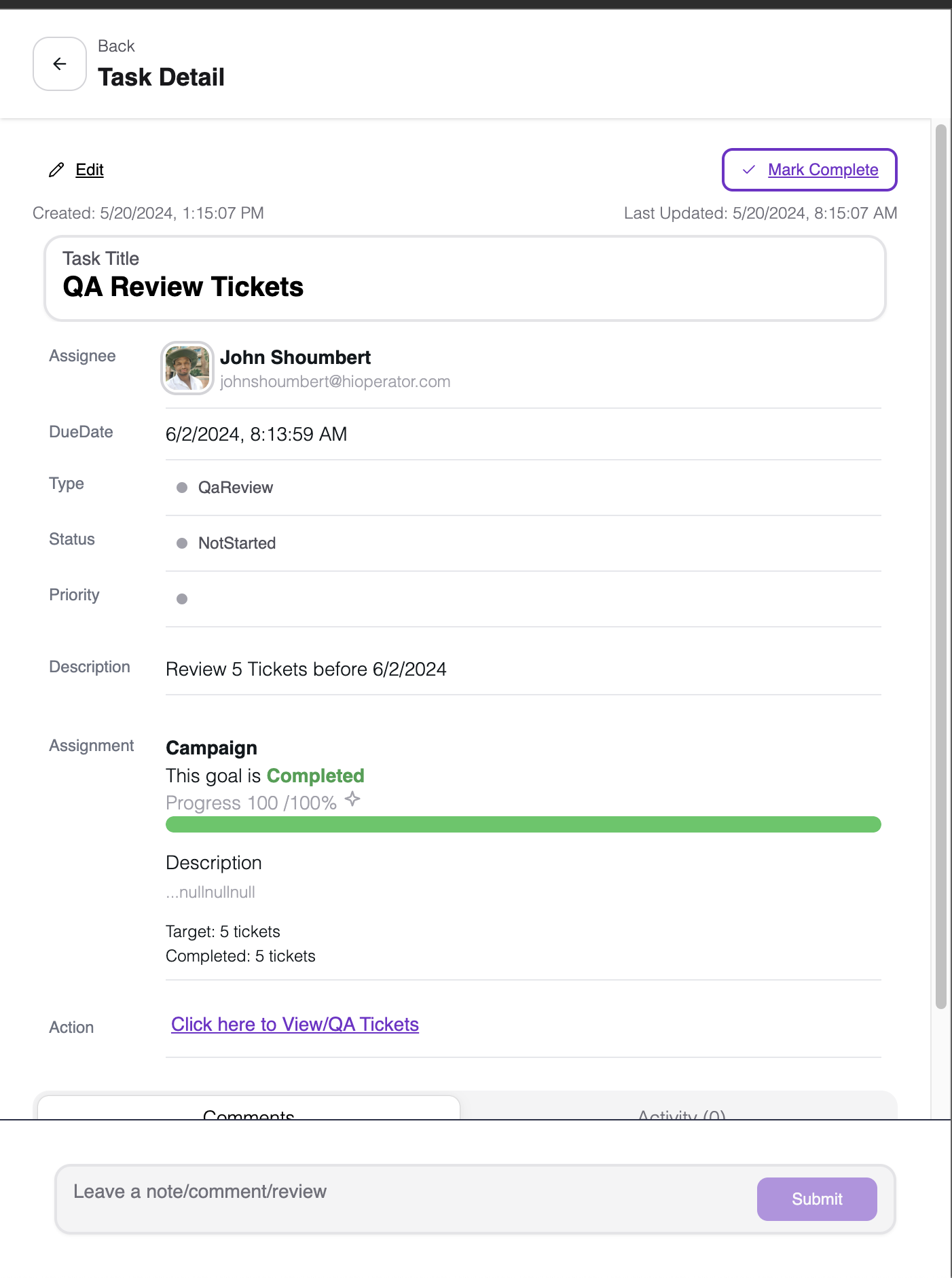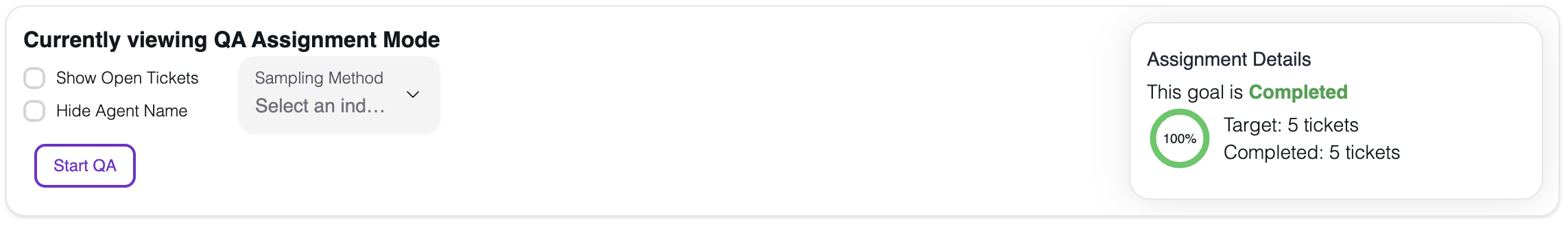 QA Review Task Show Open Tickets Hide Agent Name Sampling Method Assignment Details Goal Status Target vs Completed