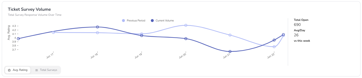 This chart visualizes trends in customer satisfaction ratings and survey volume, allowing comparisons between the current and previous time periods.