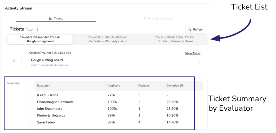 The ticket list shows all tickets included in this calibration session in a horizontal scrollable bar. Click any ticket to load its details below. This makes it easy to jump back and forth between tickets under review and ensures everyone’s looking at the same interaction. The summary is a side by side table of each reviewer's: