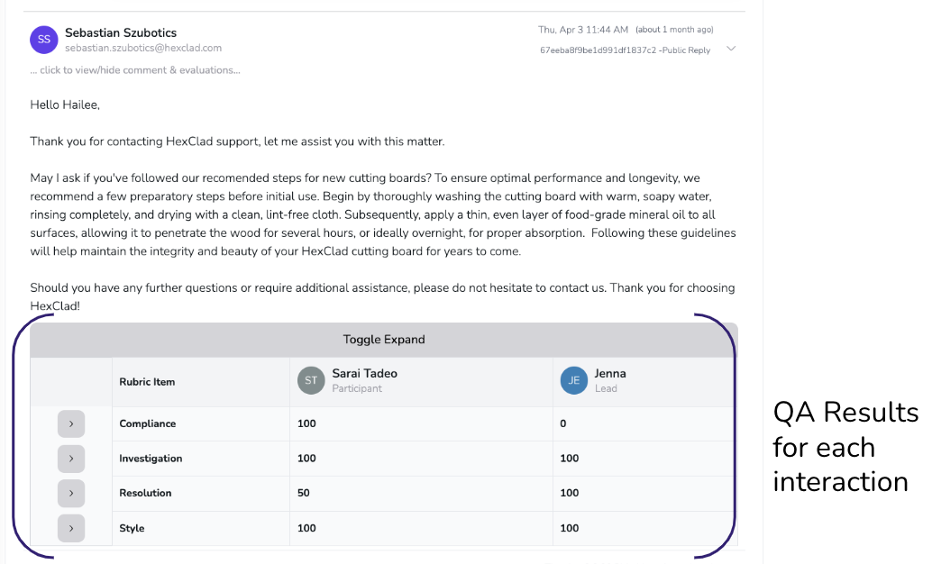 Expands the detailed rubric evaluation for each comment or interaction within the ticket (e.g., Compliance, Investigation, Resolution, Style). Reviewers can compare their rubric-level scores, uncovering specific criteria where interpretations diverge—perfect for pinpointing exactly which rubric items need clearer definitions or additional training.
