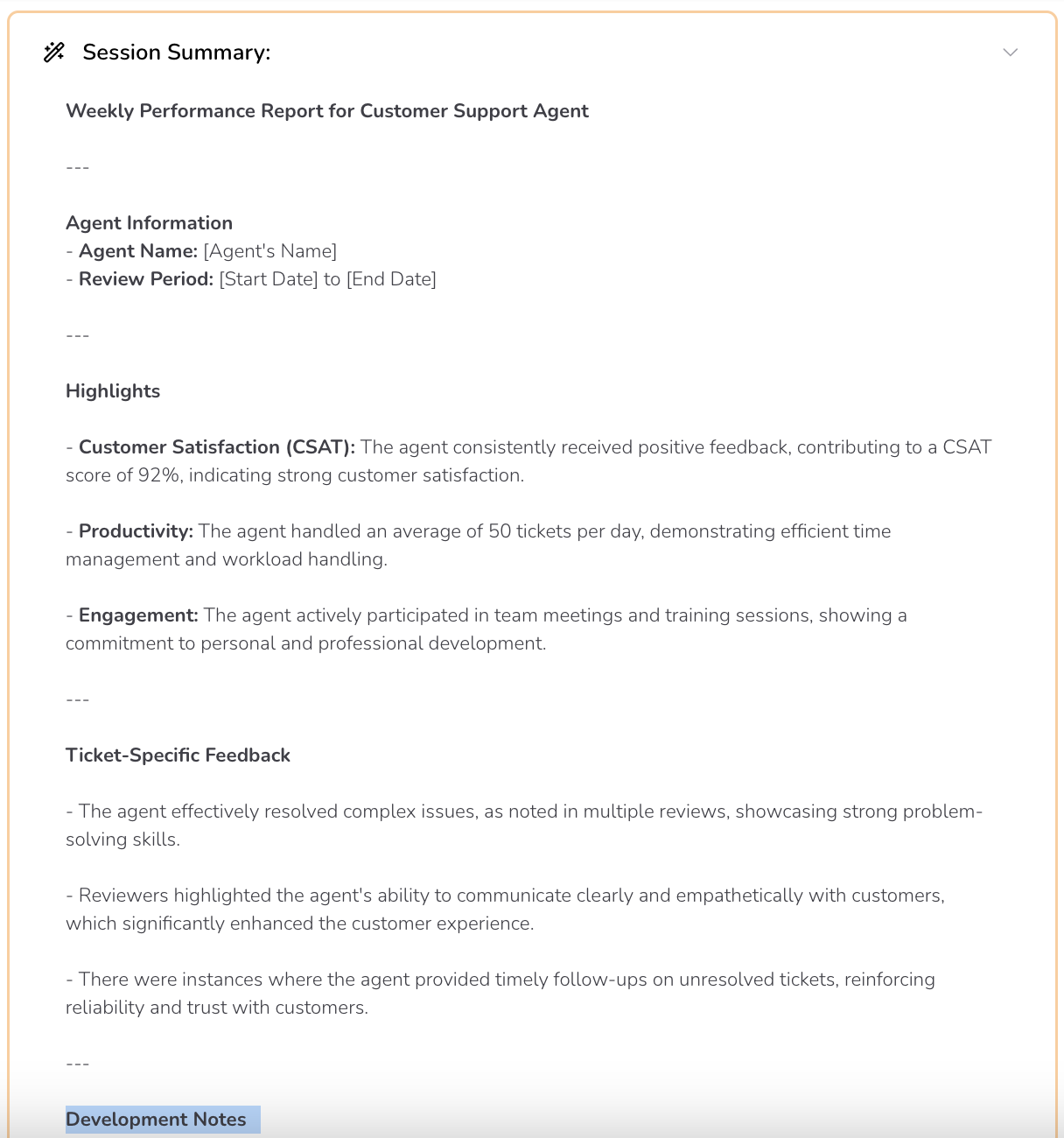 Instantly reference ticket metrics, CSAT trends, and QA scores to ground coaching in real performance data. - Structured Feedback Flow